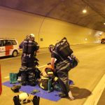 Auf der S1 fand wieder die alljährliche Tunnelübung mit den Feuerwehren Korneuburg, Stockerau, Langenzersdorf und Königsbrunn statt. Kurz nach dem Tunnel Stetten fand das erste Unfallszenario, welches einen Auffahrunfall mit 3 PKW darstellte, satt. Der zweite Unfall fand im Tradenbergtunnel statt. Hier krachte eine junge Frau mit einem Caravan in einen Schadstoff – LKW, welcher Salpetersäure geladen hatte. Der LKW – Fahrer, welcher unter großem Schock stand, wurde von einem Atemschutzträger der Feuerwehr Enzersfeld zur Betreuung an die Rettung übergeben. Das eingeklemmte Unfallopfer wurde von der Feuerwehr Korneuburg mit dem hydraulischen Rettungssatz befreit und anschließend durch Kameraden im Schadstoffanzug der Stufe 3 (Ganzkörperschatz) zur Rettungsstation gebracht. Nach der Personenrettung legte die Feuerwehr noch einen rießen Schaumteppich über die ausgeronnene Salpetersäure und reinigte anschließend die Fahrbahn.
