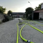 Hierzu wurde eine Versorgungsleitung von zwei Hydranten gelegt. Ein Hydrant speiste direkt die Einbaupumpe unseres Rüstlöschfahrzeugs, der zweite diente zur Versorgung von zwei Hohlstrahlrohren, die von der Mannschaft des HLFs besetzt waren. Hier wurde die Tragkraftspritze zur Förderung des Löschwassers genutzt.