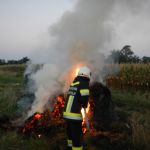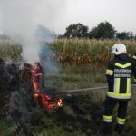 Am Mittwoch um 19:13 Uhr wurden wir mittels Blaulicht – SMS und Sirene zu einem Flurbrand auf der Bahnstraße gerufen. Bei der Anfahrt zum Einsatzort begegneten wir bereits dem Landwirt, dem das Feld und die zu brennen begonnenen Stohballen gehörten. Dieser holte anschließend einen Frontlader um das Brandobjekt auseinander zuteilen.