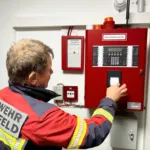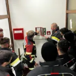 Bereits im Windfang des Altbestands führte uns der Sachbearbeiter in die verschiedenen Auslöser sowie das für uns besonders wichtige Feuerwehrbedienteil ein. Der Inhalt des Blechkastens mit der Aufschrift „Feuerwehrpläne“ machte besonders deutlich, dass es beim Brandschutz auch um die Sicherheit der Einsatzkräfte geht. So finden sich darin z.B. die Brandschutzpläne, die das Orientieren im Gebäude erheblich erleichtern oder auf Gefahren hinweisen.