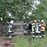 Bei dieser Übung fanden wir einen umgekippten VW – Bus vor, welcher zwischen Bäumen und Ästen auf einer Böschung lag. Nach der Ladungssicherung widmeten wir uns der Personenrettung. Hierzu schnitten wir das Dach der Führerkabine auf. Des weiteren richteten wir einen Dekoplatz ein, auf denen wir die Fässer, welche mit Nitro gefüllt waren, platzierten. Im Zuge der Dämmerung richteten wir noch eine Beleuchtung mit Hilfe unseres RLF’s ein.