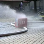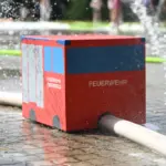 Aus dem Hallentor des Kommandofahrzeugs: Ein „Feuerwehrauto“ mit dem gewaltigen Wasserdruck eines Strahlrohres entlang eines Schlauches manövrieren.