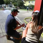 In der Wiese: Sprühschlauch & Kübelspritze – zum Erfrischen bei über 35°C stand ein unter Druck stehender Feuerwehrschlauch mit Löchern zur Verfügung. Ein solcher Schlauch wird im Einsatzfall zur Dekontamination verwendet. Weiters gab es eine Kübelspritze, mit der Tennisbälle von einem Leitkegel geschossen werden musste.