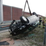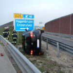 Am Einsatzort fanden wir ein auf der Seite liegendes Fahrzeug vor. Das Fahrzeug landete zwischen zwei Leitschienen eines Fahrbahnteilers. Nach kurzer Erkundung des Einsatzortes alamierten wir einen Bergekran der Feuerwehr Korneuburg.