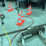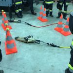 - Mittels hydraulischer Schere bzw. Spreizer je zwei Tennisbälle von je zwei Leitkegeln auf die anderen heben