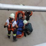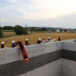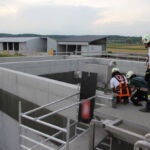 Übungsannahme war ein verunfallter Baustellenarbeiter, der in ein tiefes Becken der Kläranlage gefallen war. Mithilfe von Feuerwehrgurten, Rettungsleinen, Leitern, Rettungsgeschirr und einigen Leinen wurde der Verletzte zuerst von abgeseilten Kameraden betreut und anschließend mit der Korbtrage und einer Leiter hinaufgezogen.