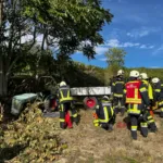 Auf dem unwegsamen und steilen Hang stürzte der Fahrer eines Traktors von der Landmaschine und wurde unter dem linken Hinterreifen eingeklemmt. Bereits bei der Anfahrt entschieden sich die beiden Maschinisten für unterschiedliche Anfahrtswege. Das RLF nahm die Route über die Hauptstraße und die Ableidingerstraße – das HLF den Weg über die Mühlengasse. Diese Entscheidung kann im Notfall das Risiko erheblich senken, wichtige Minuten zu verlieren, sollte es auf einer der Strecken zu Verzögerungen kommen.