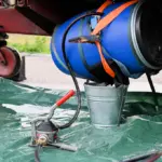 Die Mannschaft des Hilfeleistungsfahrzeugs 2 musste einen auslaufenden Tank abdichten und die ausgelaufene Flüssigkeit ordnungsgemäß binden. Da das Plastikfass kaum abdichten ging, entschieden sie sich für ein Umpumpen in eine Auffangwanne. Zusätzlich wurde ein Löscheimer untergestellt sowie einen Plane untergelegt.