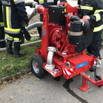 Bevor die Vestopfung der Drainage jedoch behoben werden konnte, forderten wir die Feuerwehr Harmannsdorf-Rückersdorf mit deren Hochwasserpumpe SPA 200 an, die eine Fördermenge von ca. 3000 Liter in der Minute vorweisen kann.