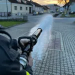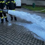 Nachdem durch die Kameraden am C-Hohlstrahlrohr „Wasser marsch“ gegeben wurde, kümmerte sich der Maschinist – gemeinsam mit den Übungsteilnehmern – um die Bereitstellung des Wasser-Schaum-Gemisches.
