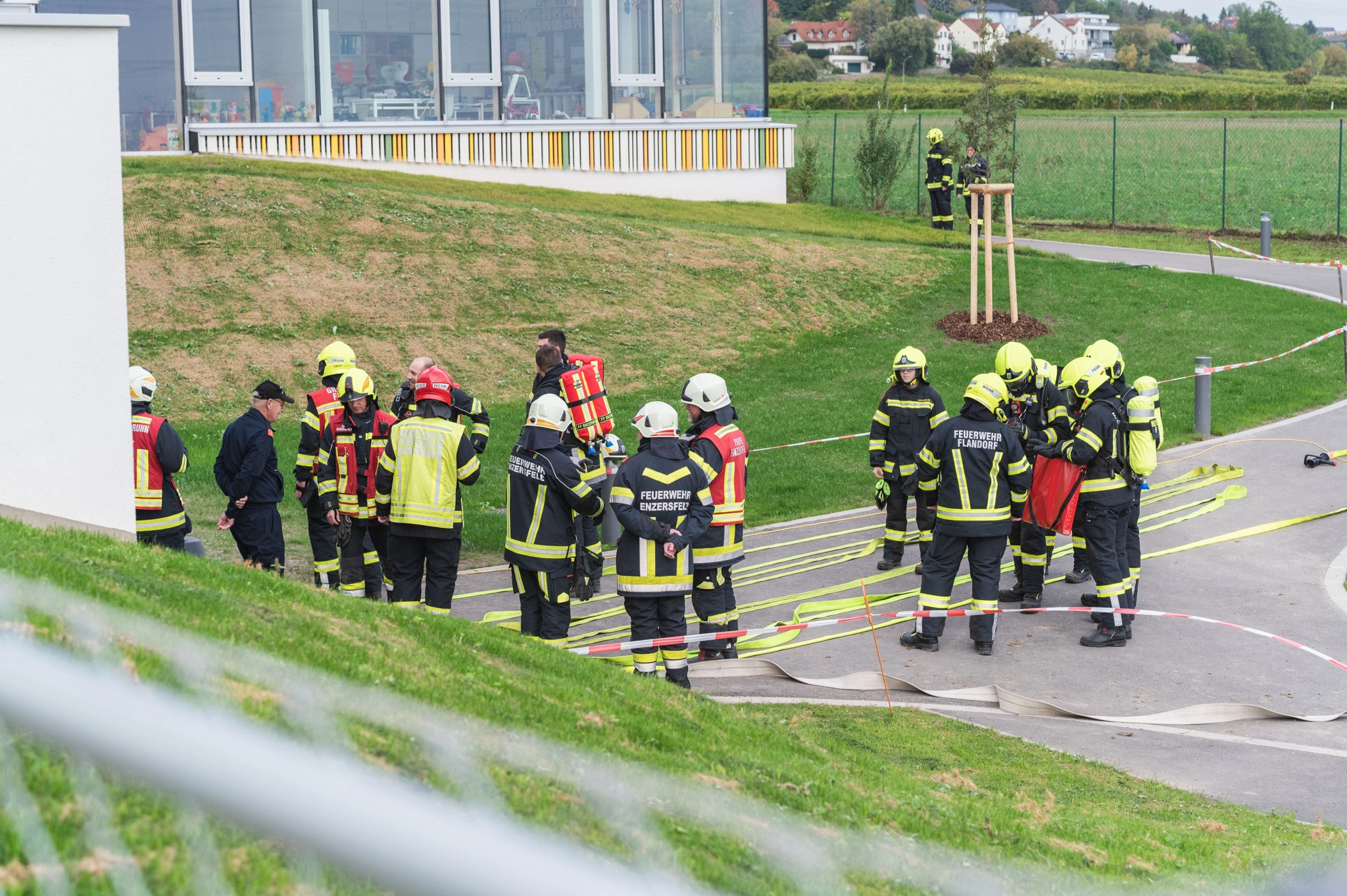 Unsere Aufgaben waren es, eine Zubringleitung zur Tragkraftspritze unseres HLFs zu legen bzw. Löschleitungen vorzubereiten. Weiters stellten wir einen Atemschutztrupp und kümmerten uns um die vermissten Personen. Auch bei der Suche am Areal des direkt angrenzenden Sportplatzes unterstützten unsere Kameraden tatkräftig.