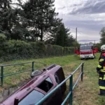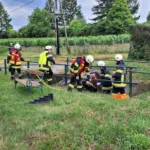 Am Übungsort angekommen, fand man einen PKW in einem Auffangbecken vor. Laut Alarmierung brannte die umliegende, sehr trockene Fläche. Umgehend gab es die Anweisung, den Brand zu löschen und anschließend die eingeklemmte Person zu betreuen – aktuell noch mit Sicherheitsabstand.